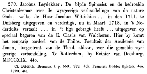 Van groot belang voor de geschiedenis van de Spinoza-receptie (of beter: Spinoza-bestrijding) is hij niet. Michiel Wielema noemt hem in het geheel niet en Jonathan Israel vermeldt alleen aan het eind van een interessant hoofdstuk in Radicale Verlichting over “De controverse over de ‘natuur van God’ (1710-1720)” over de affaire Jacob Wittich, dat Jacobus Leydekker met zijn De blyde Spinosist alarm sloeg over het oprukken van het spinozisme in de Nederlandse samenleving in het begin van de 18e eeuw (zoals ook Carolus Tuinman [blog] en Anthonius Driessen [blog] deden).
