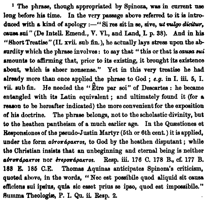 Martineau is overigens sterk in debat met Spinoza en formuleert vooral allerlei kritiek. Ik neem slechts een voorbeeldje waar het gaat over ´causa sui´ - het nogal paradoxaal klinkende veroorzaken van zichzelf van de substantie. Hij heeft goed gezien dat daarachter de overtuiging schuilt dat alles een oorzaak moet hebben. Nadat hij daar een en ander over gezegd heeft geeft hij de volgende voetnoot op p. 118