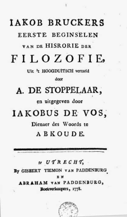 Johann Jakob Brucker, Eerste beginselen van de historie der filozofie. Vertaald door Anthony de Stoppelaar. G. T. en Abr. van Paddenburg, 1778 – books.google - het lijkt wel als een catachismus opgezet.