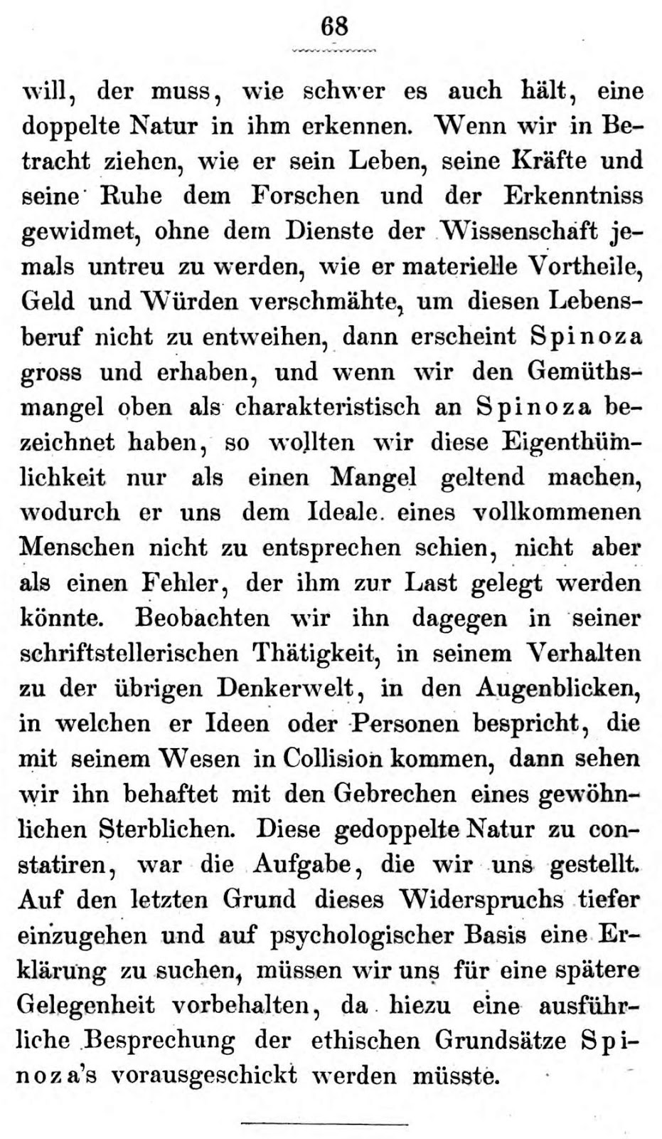 Aan het eind van de Erste Abteilung van J.B. Lehmans, Spinoza, sein Lebensbild und seine Philosophie. [Diss. Würzburg: F.E. Thein, 1864, VIII-128 pp.], nadat hij Spinoza’s karakter heeft proberen te schetsen en daarbij hetgeen anderen daarover aandroegen verwerkte, komt hij met een Schlussbetrachtung die twee pagina’s beslaat en die ik hier overneem.
