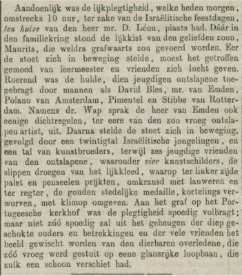 Maurits Leon werd op 10 maart 1838 in Den Haag geboren als tweede zoon van advocaat Dr. David Léon en Sarah de Vries – een Sefardische familie in redelijke welstand. Als 11-jarige jongen kreeg hij al les van de schilder Huibert van Hove. In 1856 ging hij in Antwerpen studeren aan de Koninklijke Academie, waarna hij naar Amsterdam trok en verbonden werd aan de studio van de schilder Pieter Greive. Vanaf 1859 exposeerde hij zijn eerste acht romantische schilderijen (“onbekend waar deze zich bevinden,” volgens Offenberg, maar hierna blijkt toch dat er enige boven water zijn). Vanaf 1862 begon hij als student van David Bles in Den Haag 2) zich te interesseren voor diens historische interesse [hierna een paar historische taferelen] en verdiepte hij zich in joodse thema’s, met name de joodse eredienst. Hij was waarschijnlijk de eerste joods-Nederlandse schilder die taferelen uit de joodse religie en de geschiedenis van de Portugese joden in Nederland ging schilderen.
