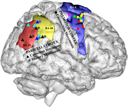 Deze maand had Science een interessant issue met een aantal interessante ontdekkingen, waarover het volgende persbericht. Uit onderzoek van een aantal patiënten die aan hersentumoren werden behandeld bleek dat stimulering van bepaalde hersengedeelten hen de intentie deed rapporteren om een lichaamsdeel te bewegen, én het gevoel dat ze dat inderdaad deden, terwijl dat in werkelijkheid niet gebeurde; en omgekeerd dat stimulering van een ander hersendeel iets kon laten bewegen, zonder dat de patiënt zich daarvan bewust was.