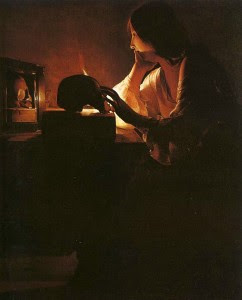 We kunnen dus maar beter niet doen wat Madeleine in het schilderij van Georges de La Tour hierboven bij het nachtkaarsje, en hieronder, zit te doen. Ja, ons kaarsje gaat ooit uit, maar als we daarover teveel nadenken en erover treuren, vergeten we te leven, de werkelijke dingen te leren begrijpen en daarover blij te zijn.