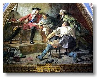 (hinten von links nach rechts: August der Starke, Johann Friedrich Böttger, Ehrenfried Walther von Tschirnhaus