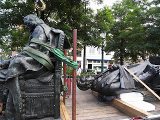 Als vervolg op het blog van gisteren, hier de foto van Hans van Houwelingen, waaruit duidelijk blijkt dat ook Spinoza's beeld van zijn Haagse sokkel is gelicht om naar de tentoonstelling van Van Houwelingen in Stroom Den Haag vervoerd te worden. Zie daarover meer in het vorige blog.