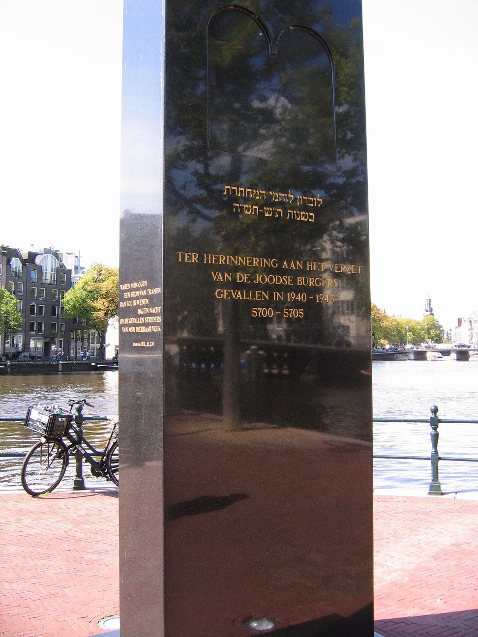 Wanneer we van deze plaats met dit fraaie uitzicht op de Amstel een stapje terug doen, zien we dit nog pas zeer recent geplaatste monument ter herinnering niet aan de joodse omgekomenen uit deze vroegere jodenbuurt, maar aan "het verzet van de joodse burgers, gevallen in 1940 - 1945, 5700 - 5705"