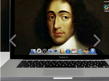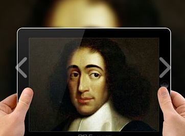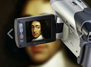 De ontwerper van de website laat een staaltje creativiteit met Spinoza zien, dat alle vertrouwen geeft in de studierichting "journalistiek en media". Zo komen allerlei plaatjes voorbij die Spinoza helemaal van deze tijd met z'n ICT en multimedialiteit doen zijn.