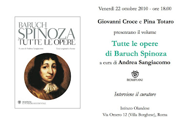 Het weblog van de Italiaanse Spinozavereniging, heeft vandaag na acht weken weer eens een berichtje, namelijk dat op 22 oktober zal plaats hebben de Presentazione del libro "Spinoza. Tutte le opere", edizione Bompiani.
