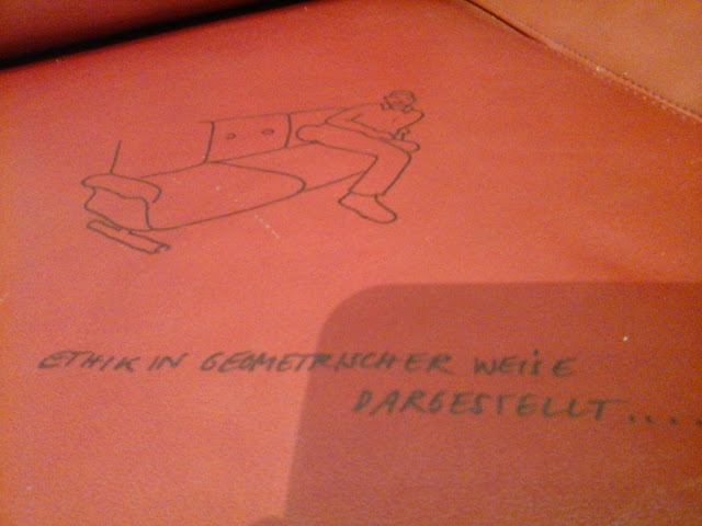 In plaats van het eerdere „Luft anhalten und an Spinoza denken,“ was de gedragsaanwijzing specifieker geworden:“Tief einatmen, Luft halten und an Spinoza's Freien Willen denken.”