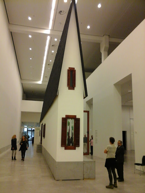 Erwin Wurm heeft zijn ouderlijk huis in Graz nagebouwd, ook het interieur, waar de bezoeker in kan en een beeld van wonen in de 1970-iger jaren krijgt, maar er niet onderuitkomt tegelijk letterlijk aan den lijve de benauwenis van die tijd 'Bei Mutti' te voelen.