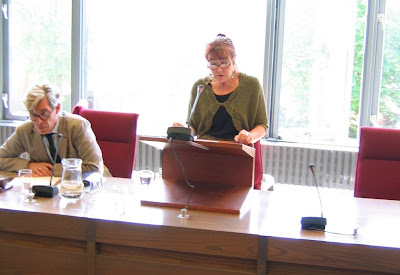 Gisteren kwam ik iets te laat aan in de oude raadszaal van Rijnsdorp, waar de jaarvergadering van de Ver. Het Spinozahuis werd gehouden en Genevieve Lloyd inmiddels al met haar lezing begonnen was. De trein had een flinke vertraging opgelopen en al nam ik daarna een taxi om de schade in te halen, het lukte me niet om op tijd te komen. Daarom heb ik hier geen foto van haar, want ik heb de – misschien wat ouderwetse fatsoens- - gewoonte om vooraf toestemming te vragen om zo’n foto te mogen nemen. Voor de inhoud van haar toespraak verwijs ik naar de uitgave die daarvan gemaakt zal worden.