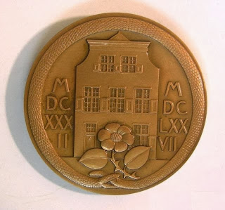 In welk jaar deze geproduceerd is, heb ik nog niet met zekerheid kunnen achterhalen, maar ik neem aan eveneens 1932. Je komt regelmatig tegen dat aanbieders menen dat het om het geboortehuis van Spinoza in Amsterdam gaat ["Dans un ourobouros, façade de la maison natale du philosophe à Amsterdam avec une rose, autour MDCXXXII - MDCLXXVII - cf hier, waar staat dat er €710 voor betaald werd].