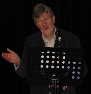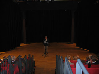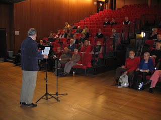 Hier een impressie van boven: spreker eenzaam op het podium. De emeritus dominee begon er dan ook over dat hij gewend was van een hogere positie naar kerkgangers in een lagere positie te preken, in het moderne onderwijs gaat dat dus omgekeerd...