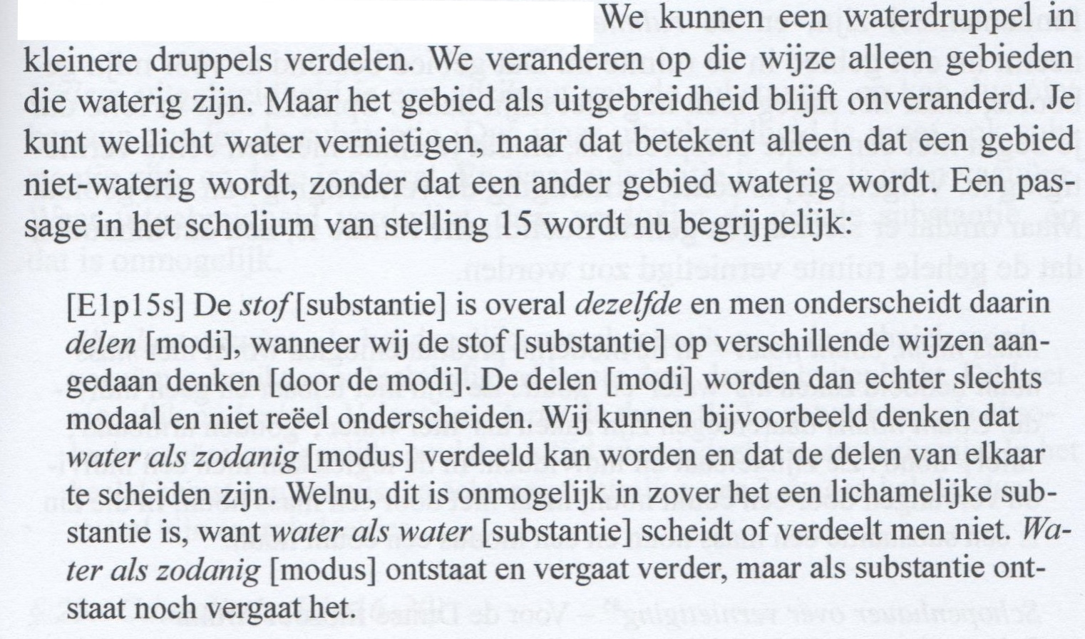 Spinoza onderscheidt in 1/15s water als water [aqua, quatenus aqua] van water als substantie [aqua quatenus substantia]; aqua, quatenus aqua is een modificatie of modus van aqua quatenus substantia. Water als modus [aqua, quatenus aqua] zien we [met onze verbeelding] als scheidbaar en verdeelbaar; water als substantie weten we [met ons verstand], is onscheidbaar en onverdeelbaar.