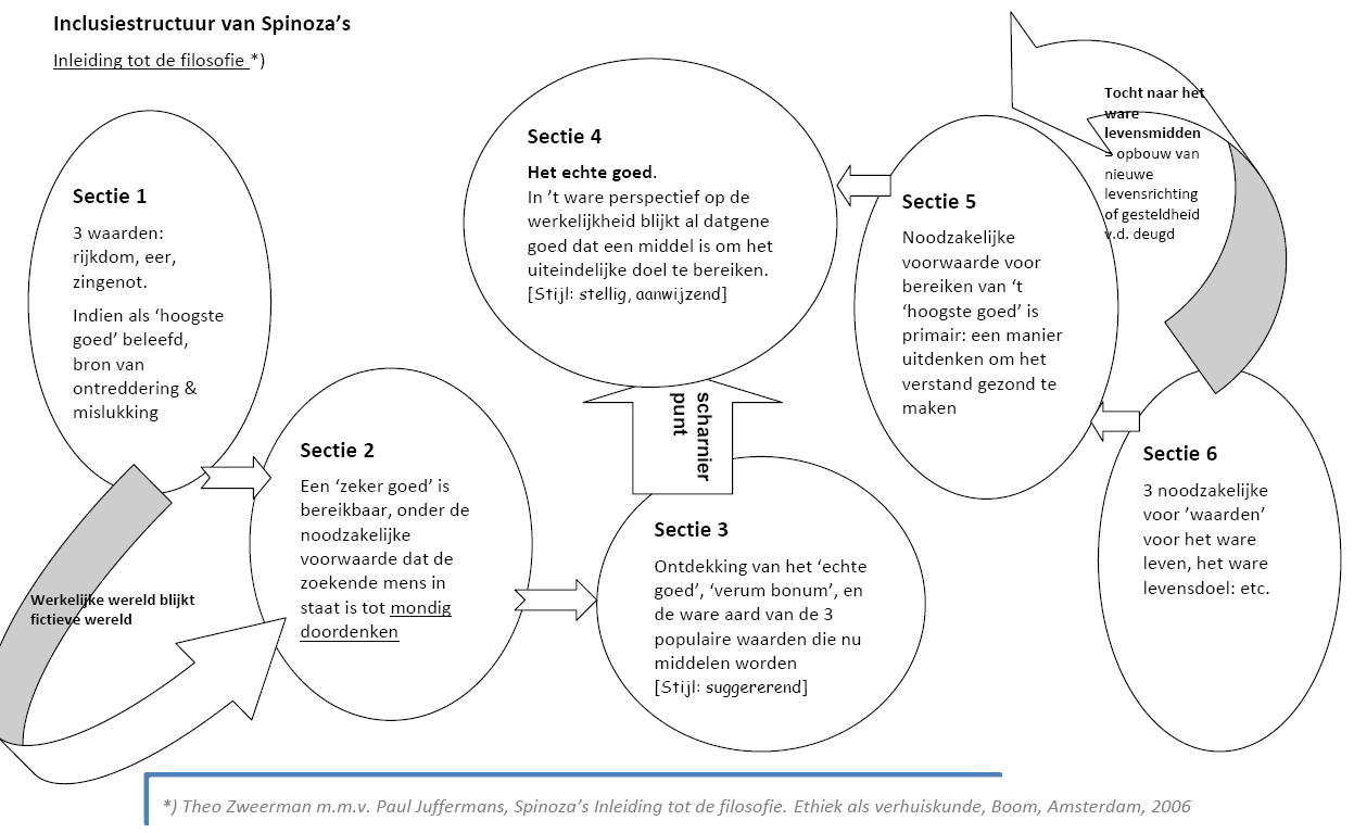 Dat dit laatste zo is, komt de lezer te weten die zich laat meevoeren aan de hand van Zweerman, hoogleraar wijsbegeerte en franciscaanse spiritualiteit aan de Katholieke Theologische Universiteit te Utrecht, die enkele weken na de voltooiing van het manuscript van dit boek, op 13 oktober 2005 overleed.In rondcirkelende bewegingen van close reading, deelt Zweerman aan de hand van Spinoza’s tekst deze eerst in zeven delen in: een aanhef en zes delen, waarvan hij eerst de inhoudelijke betekenissen en structuur en vervolgens nog eens de met literaire middelen opgebouwde retorische structuur aantoont. Bij het soms woord voor woord langslopen van de tekst, waarbij hij teksten uit de Ethica, het Theologisch-politiek traktaat en de Brieven meeneemt, laat hij zien hoe Spinoza al van op jongere leeftijd de grote lijnen van zijn filosofie voor ogen staan. Hij toont het doordachte en door-en-door oprecht authentieke van Spinoza’s niet dus zomaar bedachte en in elkaar geknutselde tekst.