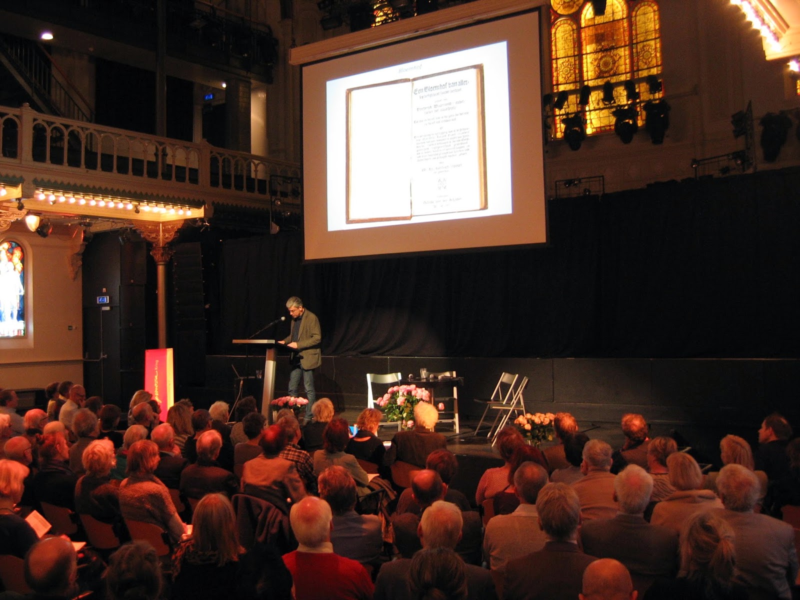 dr. Karianne Marx (docent geschiedenis van de filosofie aan de Universiteit van Utrecht en betrokken bij de ASK) stelde na zijn lezing de eerste vragen. In beeld nog de laatste dia die hij liet zien en waarin hij wethouder Kajsa Ollongren nog eens erop wees dat vorig jaar in een petitie Amsterdam gevraagd werd om ergens de herinnering aan Koerbagh vast te houden, al was het maar door een steeg naar hem te vernoemen. Na zijn lezing vertrok zij, maar dit heeft ze nog wel gehoord. Ik ben benieuwd of ze er iets mee zal doen en of er ergens in Amsterdam een herinneringsplek aan Adriaan Koerbagh zal komen.