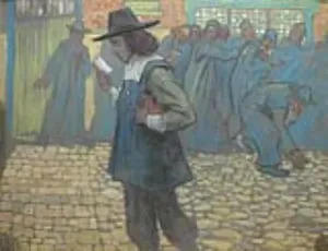 Maar van deze poster is een stukje afgesneden, en het is ook meer een 'look alike' zoals blijkt uit deze postcard uit ergens beginjaren 1900 die me authentieker voorkomt (de bespotting, het gebaar bij de deur van toegang weigeren) [van hier]: