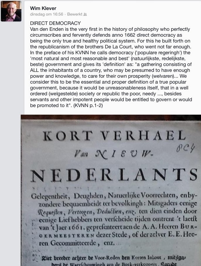 Naar aanleiding van mijn eerste, enthousiaste, bespreking van de vertaling door Karel D'huyvetters van Spinoza's Staatkundige verhandeling, waarin ik juist zijn vertaling van 'sui juris' met 'zelfgerechtigd' als een prima vondst typeerde, bleek dat Wim Klever daar juist felle bezwaren tegen had. Zie daarover de reacties op dat blog. Intussen blijkt hij daarover ook op zijn facebookpagina geschreven te hebben; hij stuurde mij daarvan onderstaande foto. Ik ben niet te beroerd om die hier op te nemen, maar moet erbij zeggen dat e.e.a. volstrekt niet to the point is. Het daarin aangeroerde raakt de zaak niet. Bij de screenprint schreef hij: "Sui juris bij Van den Enden." Nu komt de term sui juris daar bij Van den Enden niet voor en is het dus de eigen terugvertaling naar het Latijn door Klever van wat Van den Enden daar bedoeld moet hebben. Maar de uitleg van die notie is bij Spinoza niet anders, zoals we lezen in deze passage in hoofdstuk 11 §3 van de Tractatus politicus