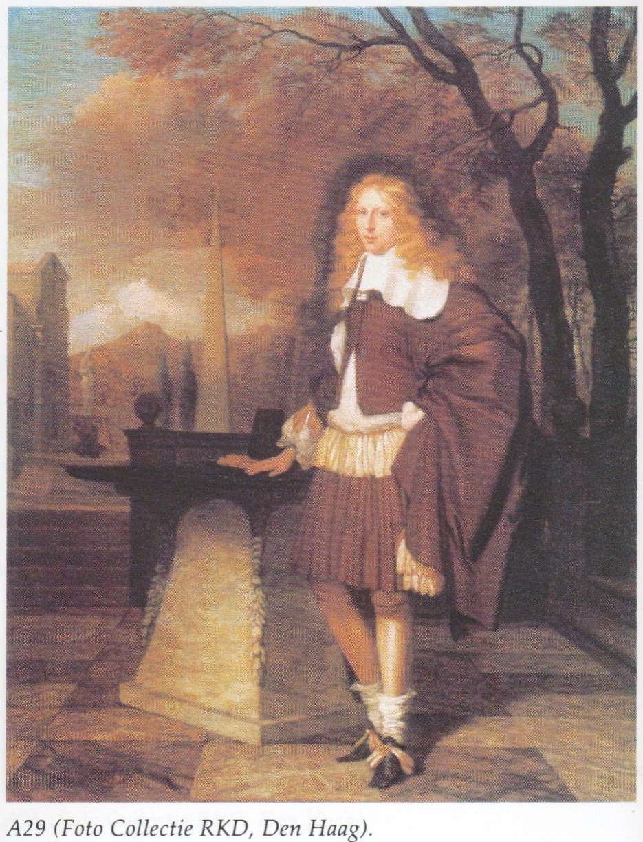 Ondanks het feit dat het hier in beide gevallen om staande, volledig weergegeven personen gaat, en dat er derhalve een verschil in proportie is binnen het geheel der compositie, zijn de compositorische overeenkomsten zeer in het oog springend: de geportretteerde op de voorgrond, het Italiaanse landschap op de achtergrond, en stenen sculpturen die mogelijkerwijze iets over de uitgebeelde persoon zeggen (Venus met appel op het portret van 1663, Demosthenes op het portret uit 1666).