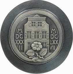In welk jaar deze geproduceerd is, heb ik nog niet met zekerheid kunnen achterhalen, maar ik neem aan eveneens 1932. Je komt regelmatig tegen dat aanbieders menen dat het om het geboortehuis van Spinoza in Amsterdam gaat ["Dans un ourobouros, façade de la maison natale du philosophe à Amsterdam avec une rose, autour MDCXXXII - MDCLXXVII - cf hier, waar staat dat er €710 voor betaald werd].
